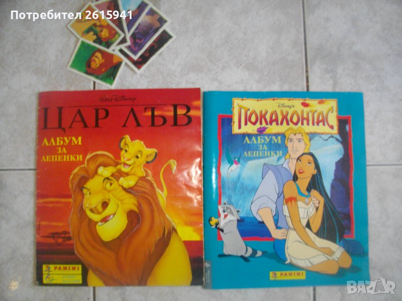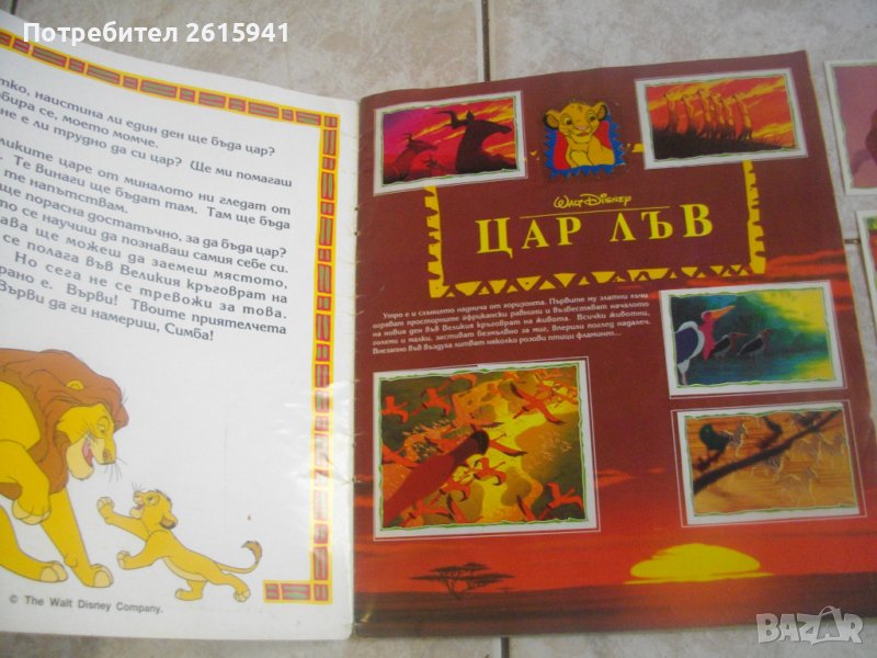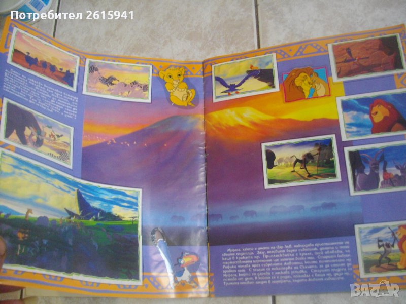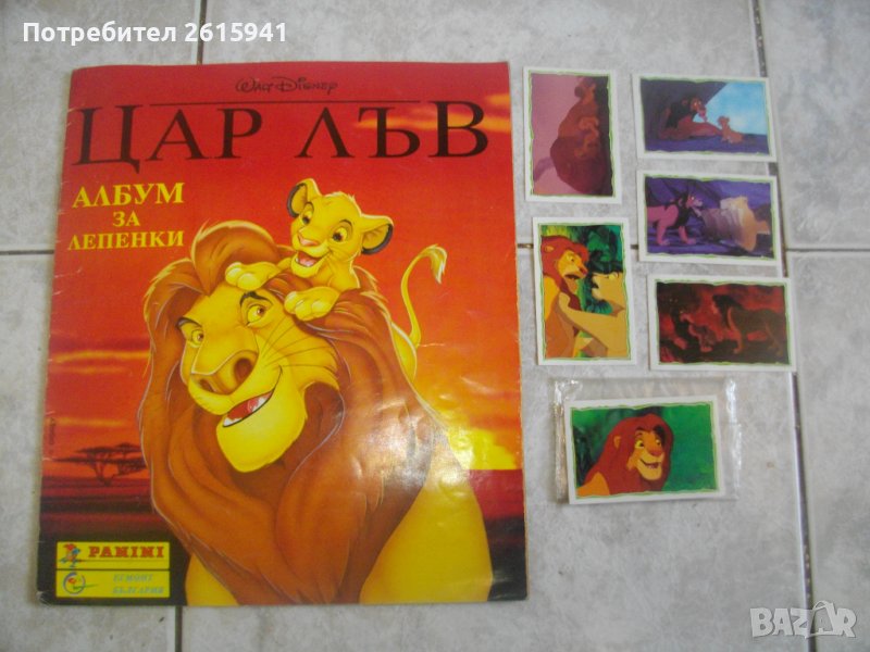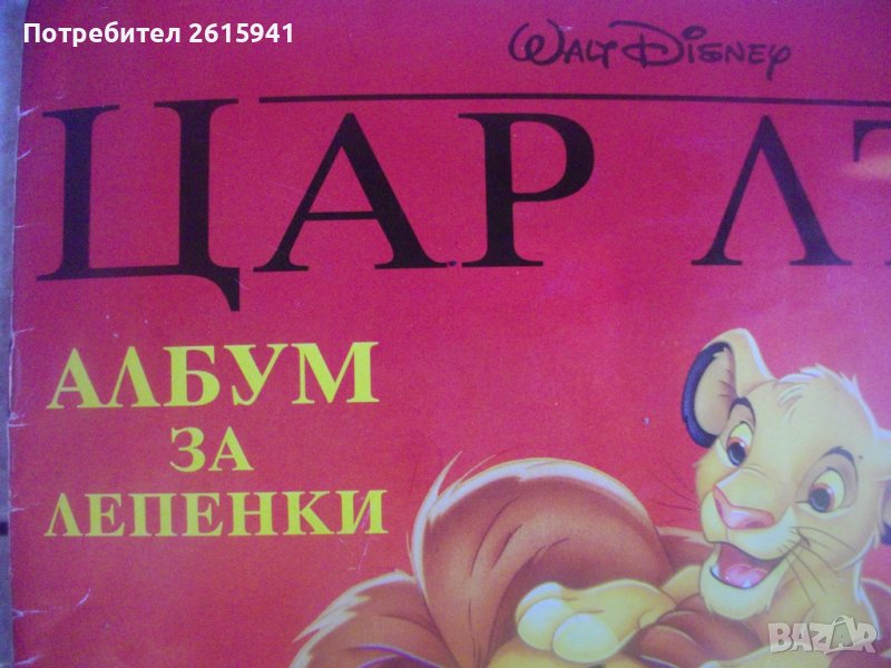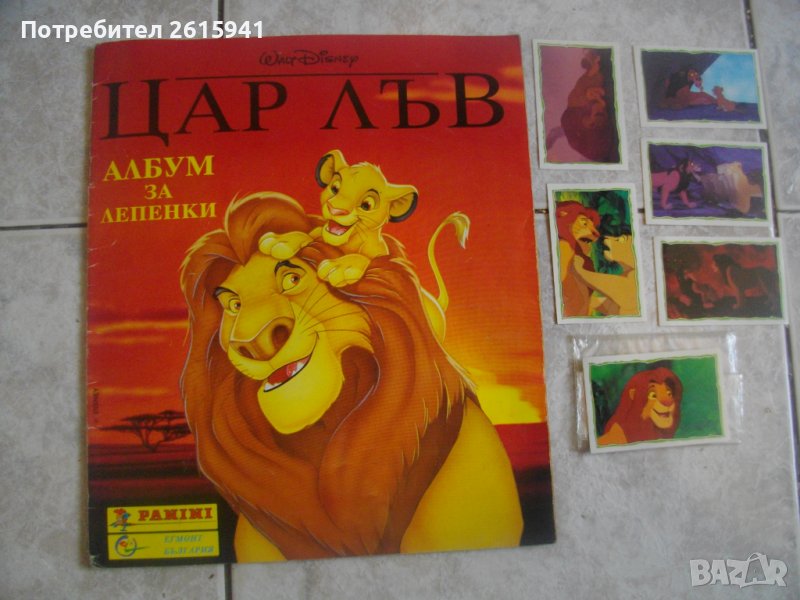 Албум за лепенки/стикери на Цар Лъв на Disney, издаден 1995г. от изд.Панини - Егмонд България. Пълен изцяло с лепенки, плюс допълнителни лепенки/стикери. Цена 299 лв. ПРОДАДЕН
