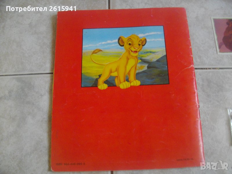 ОПИСАНИЕ на албум Цар Лъв. Запълнен изцяло с всички номера стикери за албума.1995г. Къ м албума има още 6 бр. нови, нелепени лепенки, различни номера. Общо залепени са 182 бр малки и големи /двойни, тройни и четворни стикера./ Гланцови страници и корици на албума. Отлично ТОП състояние. Съвсем бегли, почти незабележими следи от употреба на албума.Размери на албума - 270х230мм. Цена на албума и допълнителните лепенки - 299 лв.