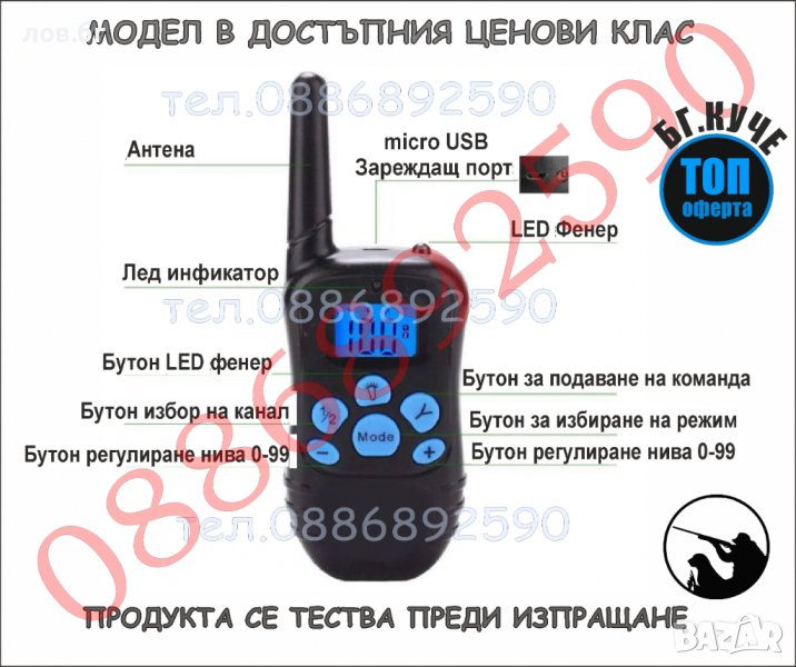 дресировъчен нашийник Модел 2021 година Допълнително модифициран, водоустойчив с презареждащи литиево йонни батерии на нашийника и дистанционното. Светещ дисплей улесняващ командите нощно време.