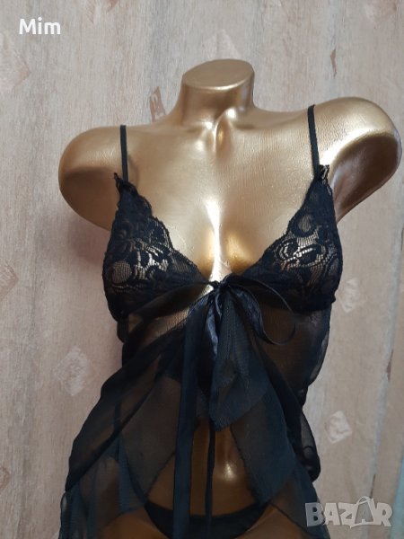 Черен къс топ нощничка от прозрачен тюл, на бюста с дантела, регулируеми презрамки, завързва се отпред със сатенена пандела, прашката е от тънка имитираща кожа. Нови без хартиен носител