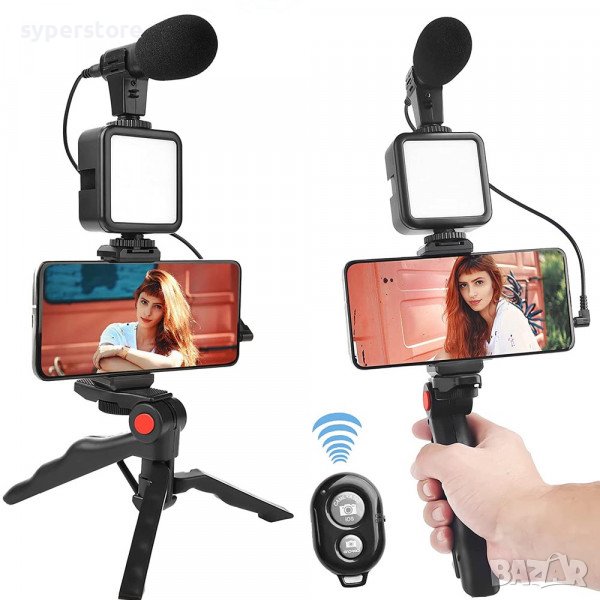 Комплект статив за създаване на видео Vlog с микрофон и светлина за излъчване на живо
