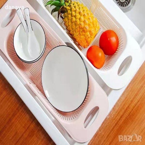 Пластмасов, разгегателен гевгир за кухненска мивка. Мултифункционален сушилник, който се поставя върху кухненската мивка. С негова помощ лесно и удобно ще измиете плодове, зеленчуци, паста и други хранителни продукти. Може да се използва и за сушилник за съдове и прибори. С дръжки от двете страни. Предлагат се в различни цветове – сив, розов, светло бежов.