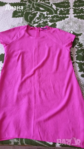 Маркова рокля в наситенорозово, леко асиметрична долу, има цип на гърба и полупаднал ръкав, приятна материя. По етикет е GB 16, отговаря на Л ХЛ. Дълж.87, ГО 55, Т 54, Х 57см едностранно. Запазена, с нормални следи от употреба.