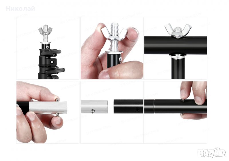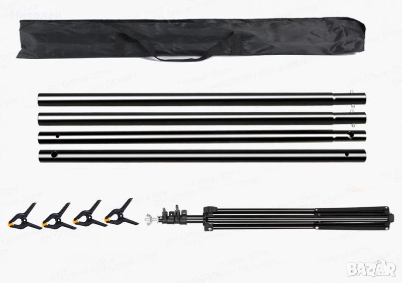 Метална разтегателна стойка за зелен екран. Може да се регулират размерите на височина и широчина. Максималните размери са височина 200 см широчина 200 см. Комплекта включва :