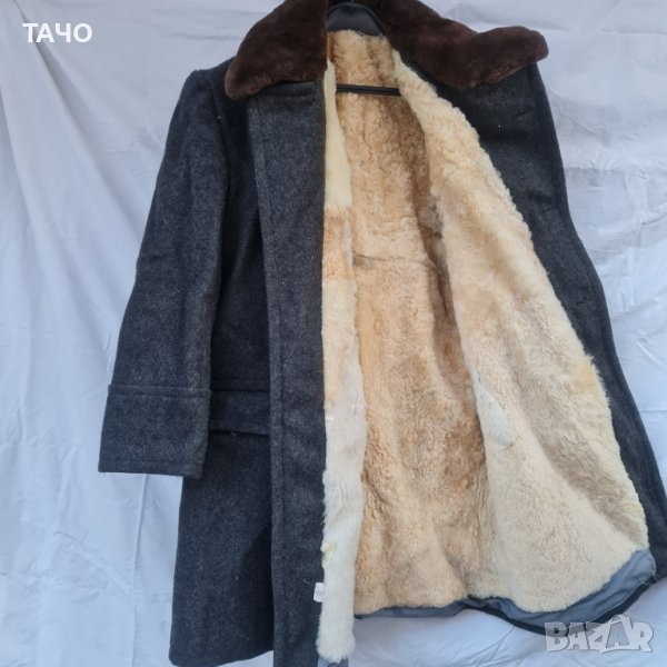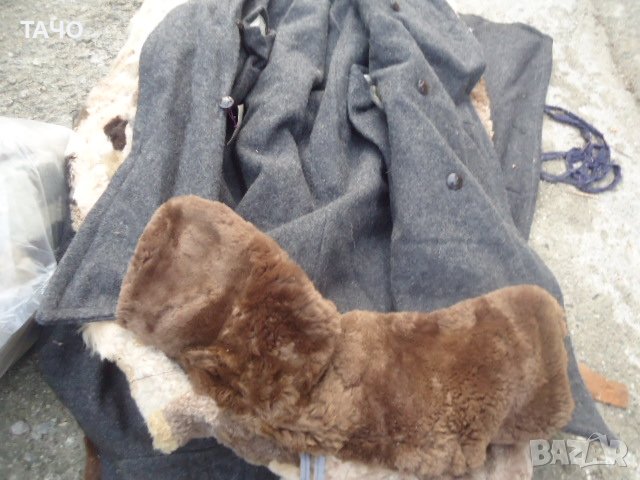 Войнишки габини с подплата от естествена агнешка кожа. Външна част - здрав сив шаяк. Яка от естествена кожа.