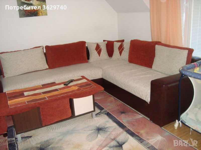Продавам голям ъглов диван с размери 280см/230см., дълбочина - 90см, на седяща част - 75см. Дивана се състои от три отделни модула (две диванчета и ъгъл) с 4 големи и 3 малки възглавници. Задна част и подлакътници - кафява кожа, възглавници и седяща част - мека дамаска велур от висок клас, цвят брик. Всички възглавници са с цип и могат да се перат. Дивана има функция сън с матрак и ракла. Ползван е винаги с втора дамаска на седящата част, закупена допълнително (последната снимка) При размяна на подлакътниците може да се ползва като ляв и десен диван. Изключително запазен, без наранявания и повреди.
