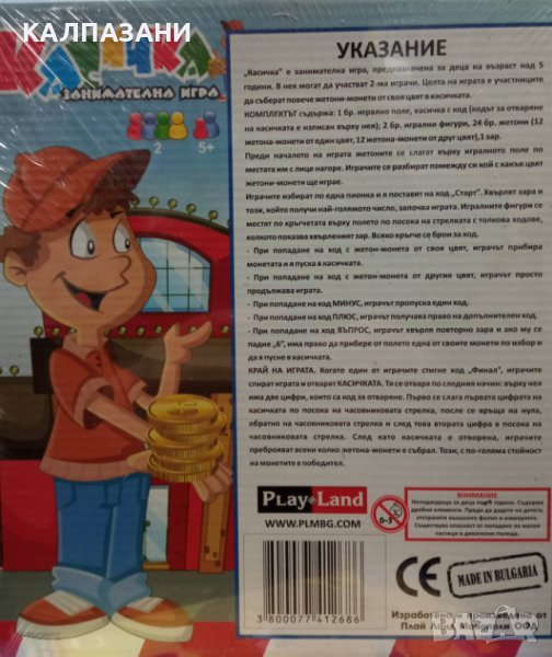 Чудесен подарък за деца, за деня на детето или за много други различни поводи. С помоща на тази игра, ще може да се научите да спестявате пари. Занимателната игра "Касичка"е подходяща за деца над пет годишна възраст. В нея могат да участват максимум двама играчи. Като целта на играта е да се съберат колкото се може повече монети- жетони, от своя цвят в касичката, които са включени в комплекта.