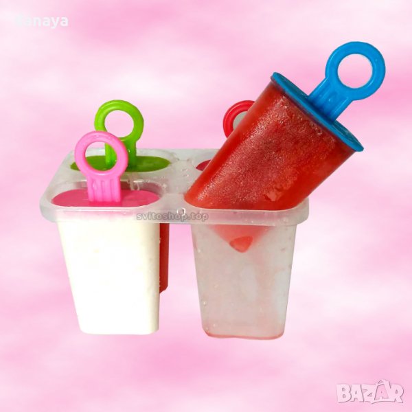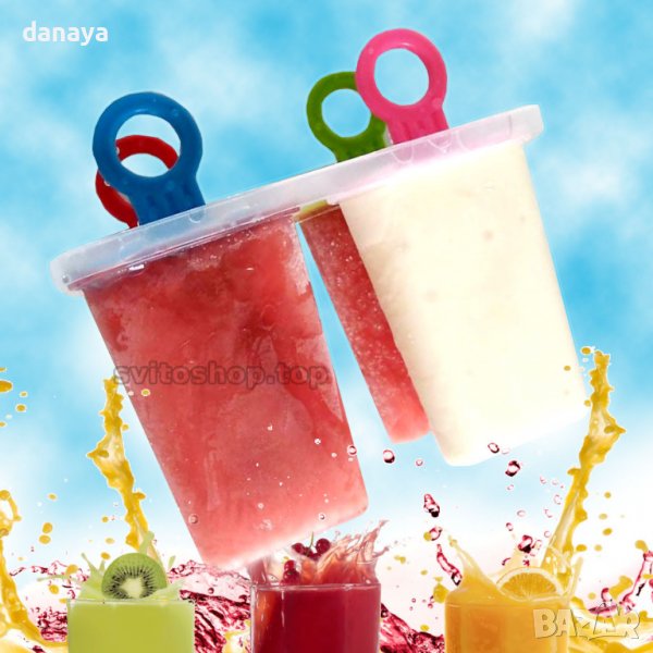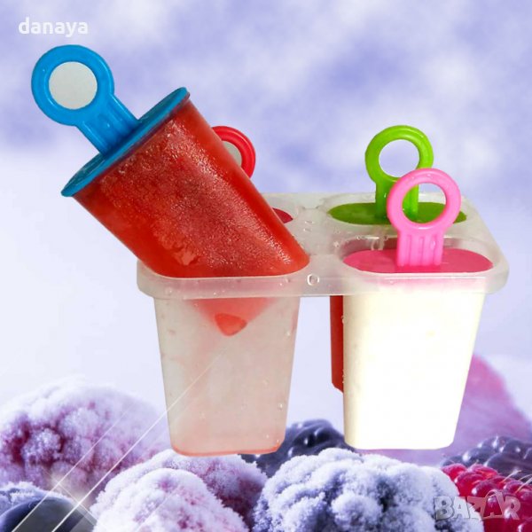 Комплект от 4 броя форми за сладолед на клечка събрани в едно. Идеални за приготвяне на вкусен и здравословен домашен сладолед Ескимо. Децата обожават ледени близалки! Формите са идеални за летните горещи дни. Супер лесни за употреба – просто напълнете формите с любимия разбит компот, плодов сок, фреш или млечен шейк, оставете за 2-3 часа във фризера и вече имате вкусен домашен сладолед!