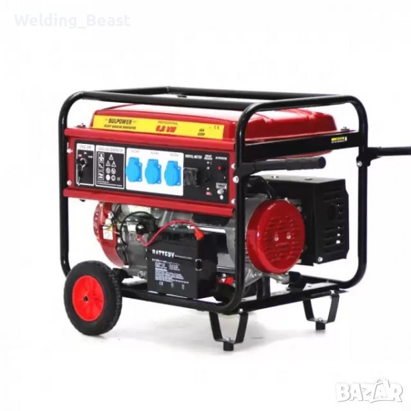 6.5 КВ нови бензинови четиритактови генератори „BULPOWER“ за Tрифазен и Mонофазен ток / комбинирано/, с вградена фабрична автоматика в генератора. Генераторите са с медни ротори и статори и са оборудвани с автоматичен смукач, Двигател: GX 660 с въздушно охлаждане, 16 конски сили, работна честота: 50 Hz. Вграден AVR / Automatic Voltage Regullator / - вградена платка за автоматично регулиране и стабилизиране на напрежението- могат без проблем и без никакви смущения да работят всякакви прецизни електроуреди като LED, LCD и Plasma телевизори, компютри, непрекъсваеми захранвания (UPS-и) и много други подобни. Автоматичен предпазител против претоварване на генератора, магнетен стартер и автостартер с ключ и акумулатор, транспортна рамка с колела и дръжки за по-лесно предвижване на генератора. Генератора има вграден дигитален дисплей показващ изходящият моментен волтаж и отработените моточасове + 1 броя изходи за 230 V, един изход за 380 V и един за 12 V. Разход: 1,8 литра бензин на мото час, при пълно натоварване. Размери: дължина 71 см. без дръжки и 109 см. с разпънати дръжки, ширина 54 см. без гуми и 66 см. с гумите, височина 58 см. без гуми и 66 см. с гумите. Тегло без гориво - 95 кг.
