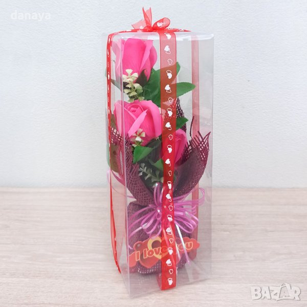 Красив изкуствен букет рози с надпис I love you, опакован в прозрачна пвц кутия и текстилна панделка на сърца. Красив подаръчен комплект за Свети Валентин, за Осми Март, за юбилей, рожден ден и всякакви други поводи. Розите се предлагат в различни цветове.