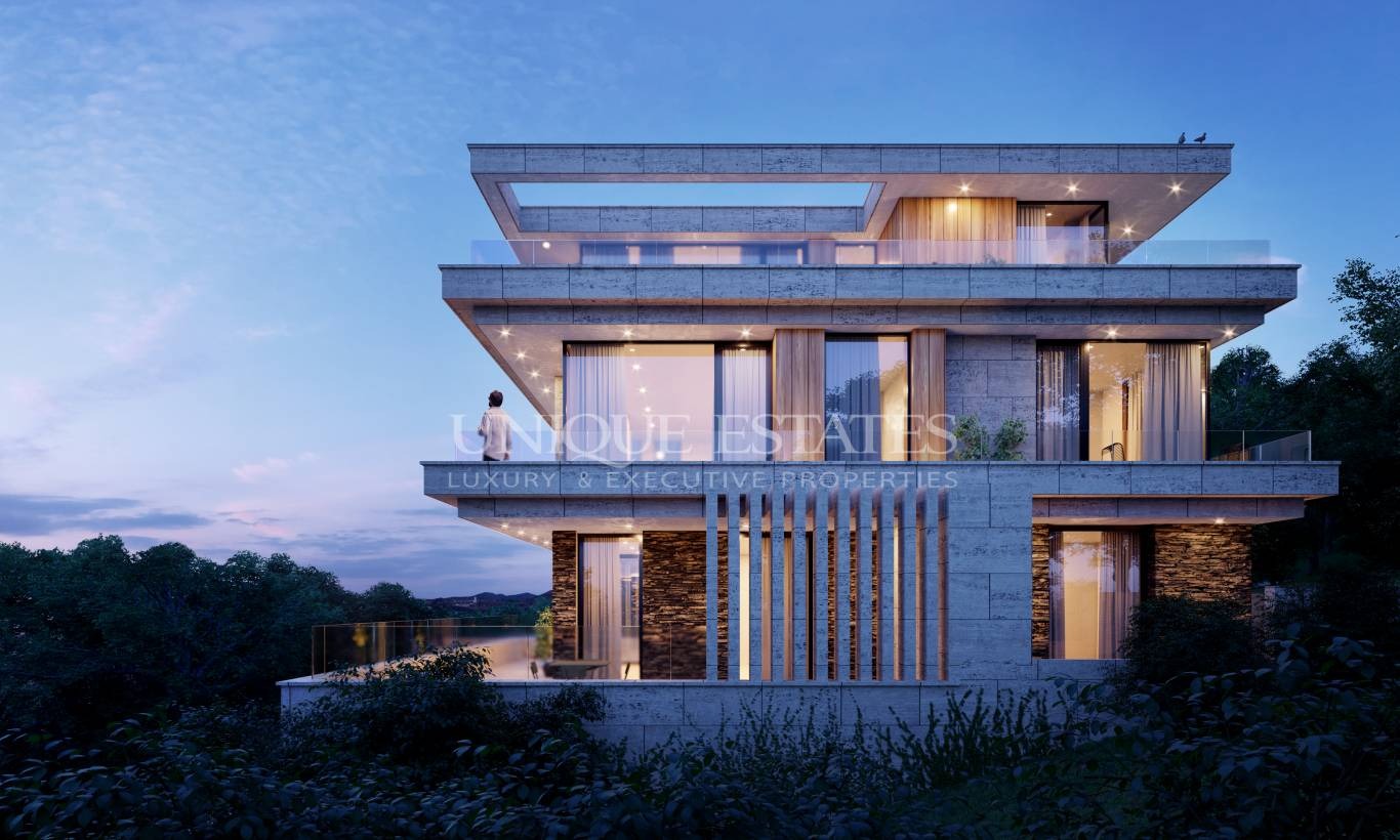 Разпределението на всяка къща включва индивидуален гараж за три автомобила, СПА зона, просторна дневна с трапезария и кухненски бокс, както и четири спални, всяка със собствена баня и гардеробна. Жилищните пространства са допълнени от тераси с панорамни гледки към града и планината Витоша. Цената е без включен ДДС. Ref. ID:17092