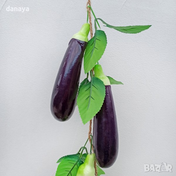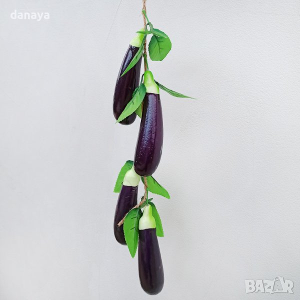 Реалистичен изкуствен патладжан на връзка, която се състои от 4 броя патладжани. Изкуствени зеленчуци, чудесни за декор и украса в битов кът, кухня, декориране на заведения, магазини и всякакъв тип помещения. Ръчна изработка.