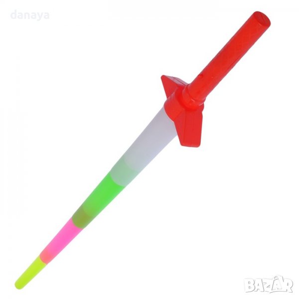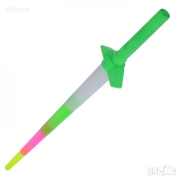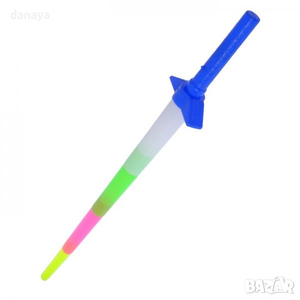Пластмасова детска играчка за момчета и момичета. Голям сгъваем меч, който свети в цветни светлини. Мечът се сгъва и разпъва. Когато е сгънат е с дължина 29 см, а когато се разпъне става дълъг 67 см. Тази пластмасова светеща играчка ще се превърне в любима на децата.