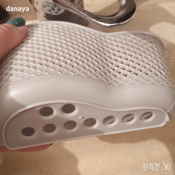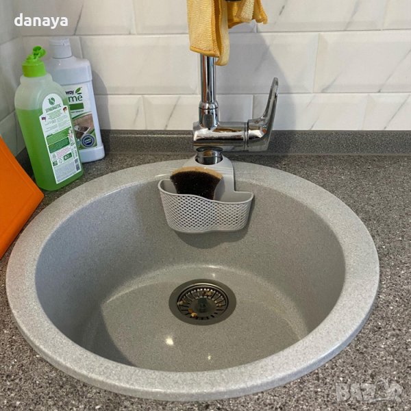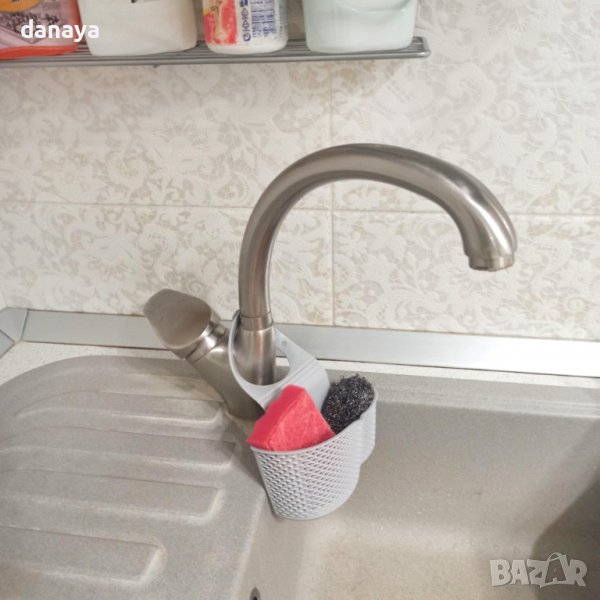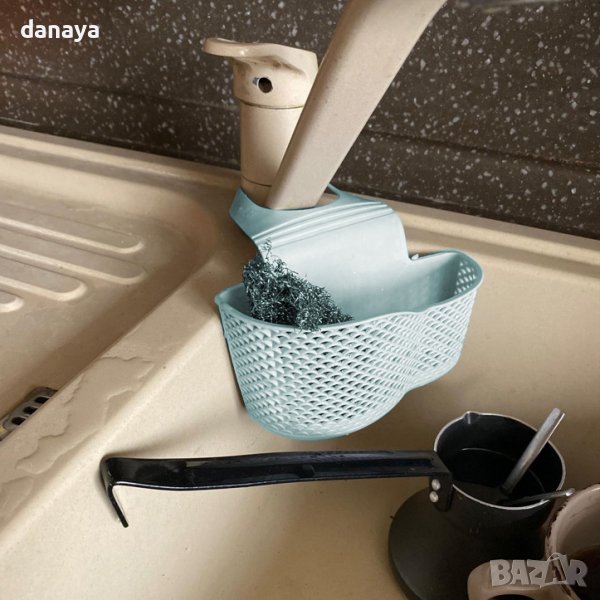 Държач за гъби, който се закача за смесителите в кухнята или банята. Закачаща се регулируема кухненска поставка за мивка. Поставка за домакински гъби, телчета, попивателни кърпи, сапуни и други почистващи аксесоари. Със закопчалка и отвори за отцеждане. Може да се постави и на душа в банята. Предлага се в розов, сив и синьо-зелен цвят.