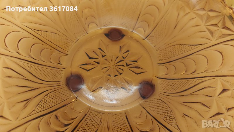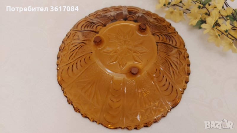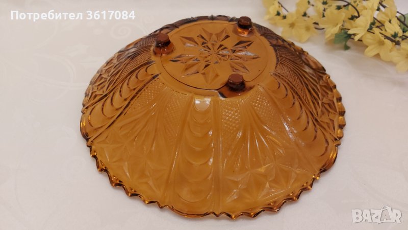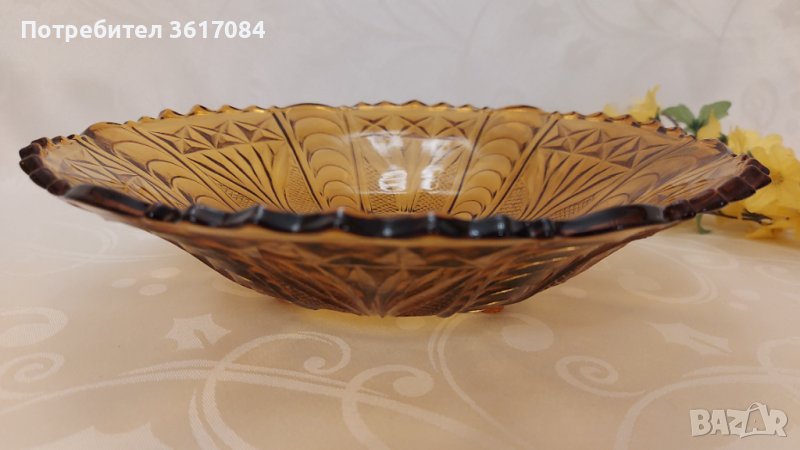 Антикварна купа, фруктиера (дори антика) на три крачета от 30-те години в стил Арт Деко, от масивно цветно стъкло. Стъклото не е кафяво, а цвят старо злато или кехлибар. В чудесно състояние, само по крачетата отдолу има леки наранявания, което е нормално за годините й. Показано е на снимките. Диаметърът й е 28 см.