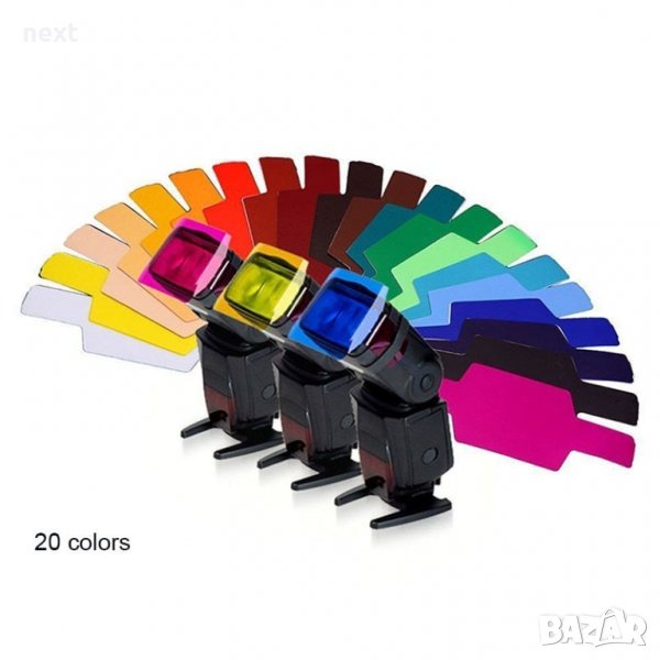 20 броя цветни филтри за светкавица, за моделиране на светлината, състоящи се от: