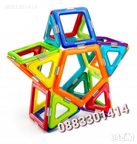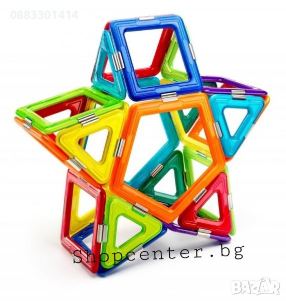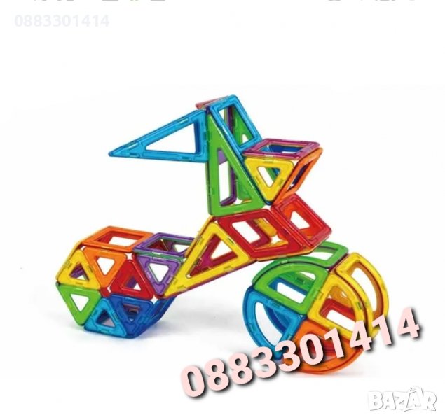 Магнитни цветни части в триъгълна, квадратна и шестоъгълна форма и заедно 4 колела и основа за безброй конструкции и уникални дизайни.
