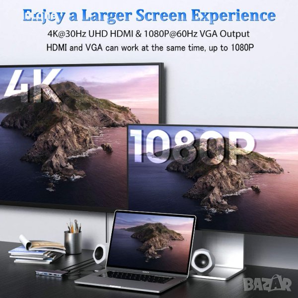 - USB C хъбът ви позволява да копирате или разширявате екрана за многозадачност, да преглеждате електронни таблици с данни, да редактирате документи, да преглеждате презентации, да гледате филми и да играете на видео игри. HDMI до 4K при 30 Hz (3840x2160), VGA до 1080p при 60 Hz. ICZI Hub Thunderbolt 3 позволява едновременно извеждане на HDMI и VGA, което кара видео презентациите да оживяват и ви осигурява перфектно визуално изживяване.