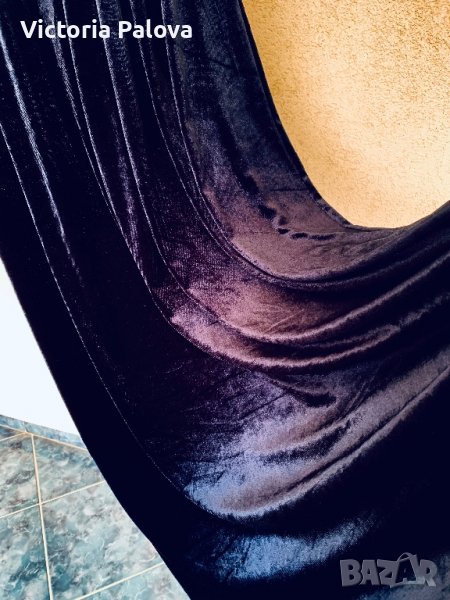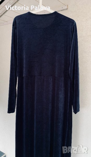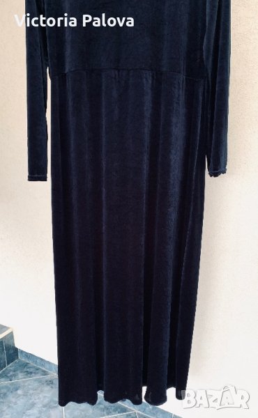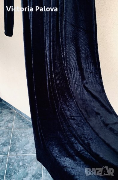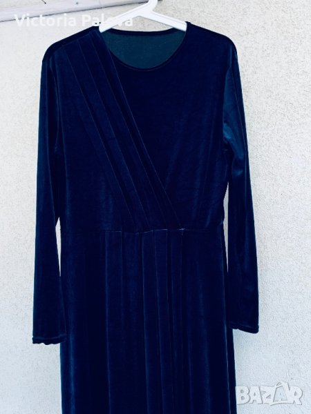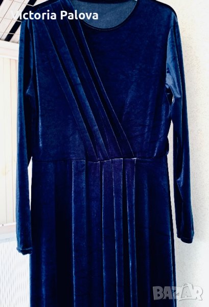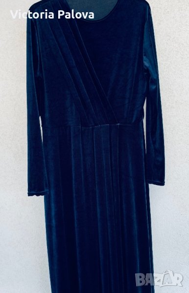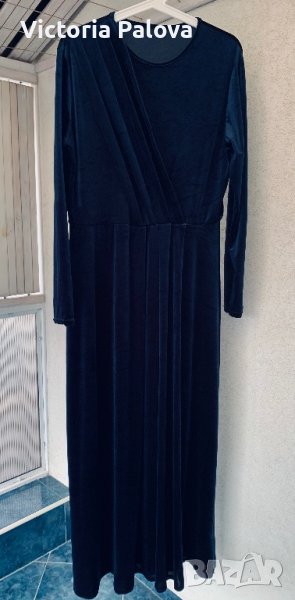Роклята е тъмносиня, комплиментарна кройка, стои прекрасно на абсолютно всички фигури, изглежда фантастично - за специални случаи или вечерни събития. към всички суперлативи и е много удобна, защото има разтегливост. рамо - 48см, ГО - 54см, дължина - 139-149см, ръкав - 60см.