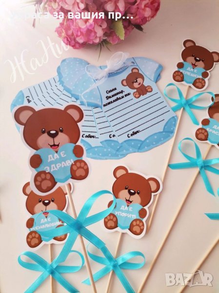 * карти във формата на боди за да може гостите да напишат своите пожелания към бебето