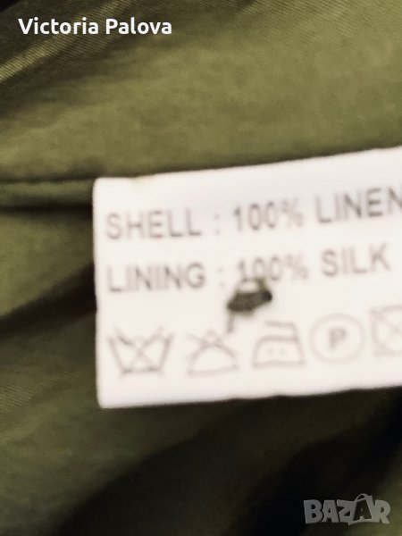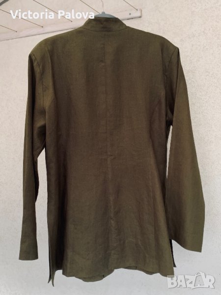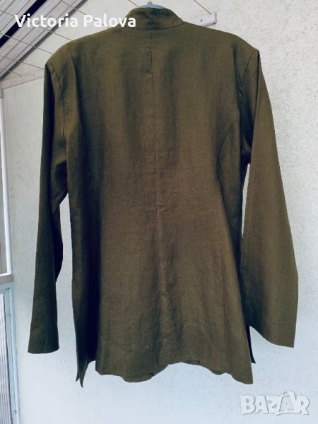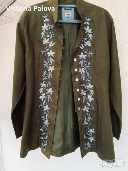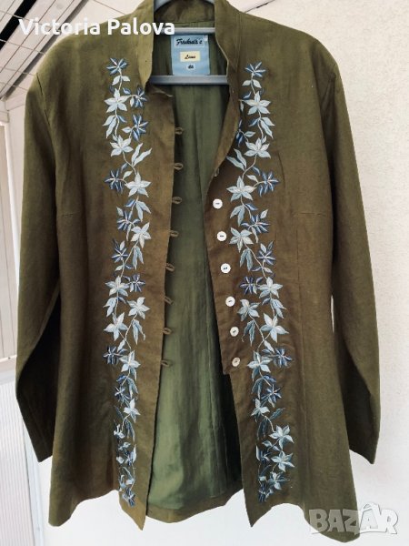 Много красиво скъпо сако-100% лен,подплатата е 100% коприна,бродерия.сакото или летен блейзър наистина е уникално и единствено.рамо-46см,ГО-56см,талия-50см,дължина-79см,в долния край закопчано ширината е 70см,цвпки-27см,ръкав-62см,леко вталено,леки подплънки.