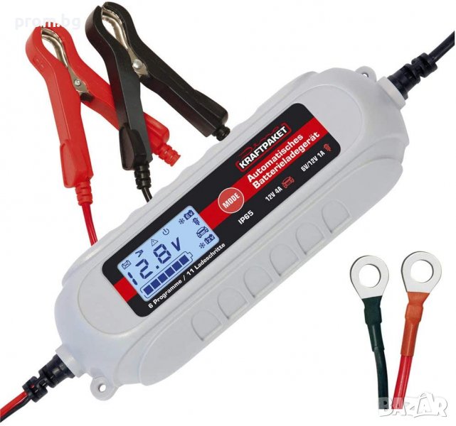зарядно устройство за акумулатори, батерии на мотоциклети, автомобили, KRAFTPAKET - Германия. Подходящо е за различни батерии: оловно киселинни, MF (капсуловани акумулатори), гел и AGM (1,2-120Ah). Има микропроцесорно управление, което позволява избор на 6 програми за зареждане. те са комбинация от 6V или 12V, комбинирано с различен ток на зареждане. (Шест програми: 7,2 V-1 A / 7,4 V-1 A / 14,4 V-1 A / 14,7 V-1 A / 14,4 V-4 A / 14,7 V-4 A)