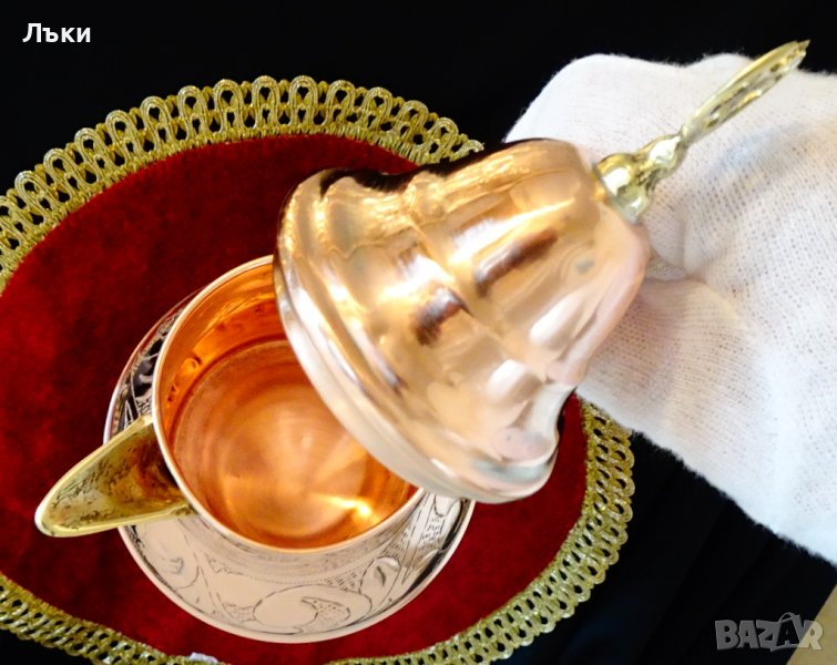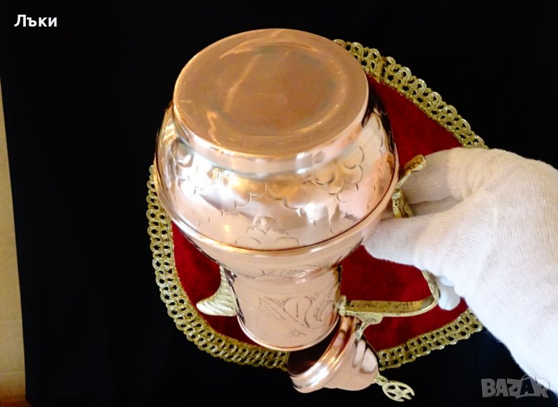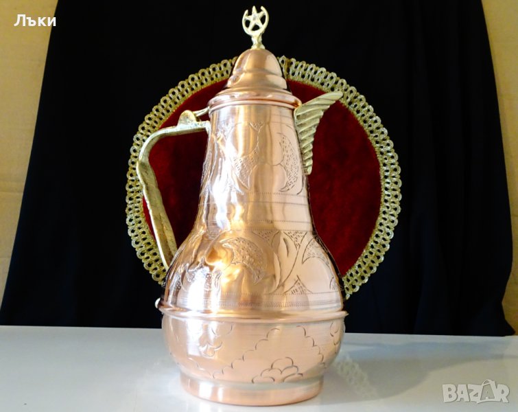 мед,релефно кована с красиви орнаменти.Дръжката и чучура са релефно отляти от масивен златен бронз.Върха на капачето е с полумесец и звезда от бронз,символи на исляма.Вътре каната не е калайдисана.Изключително качество,огледален блясък