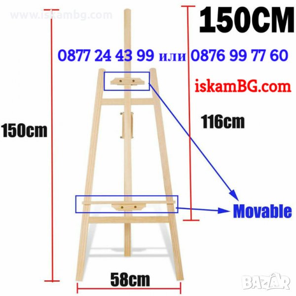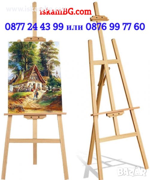 Статив (триножник), дървен 150 см. Възможност за регулиране на височината на поставяне на платното чрез плъзгащи се долен и горен ограничител. Подходящ за платна с височина от 12 до 105 см. Регулиране на наклона – ъгълът може да се променя до 15 градуса. Подходящ е както за рисувателни цели, така и за декорация. Ширина на основата на статива - 57 см.