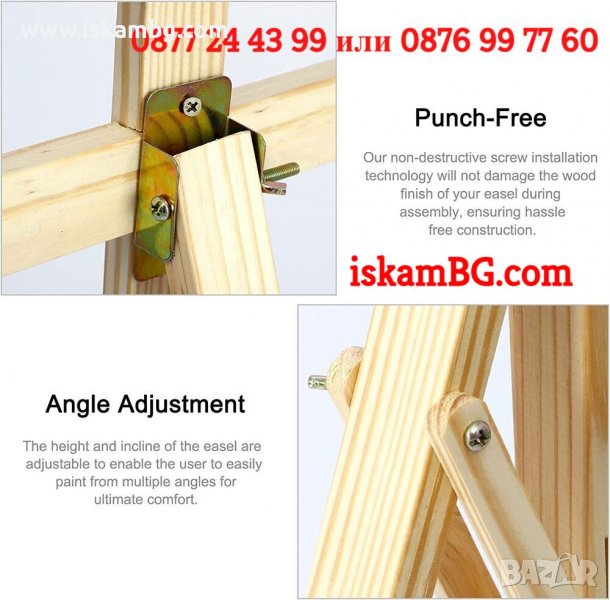 Художническият статив – триножник на е изработен от масивна букова дървесина. Импрегниран е с маслен препарат за да се усили устойчивостта на вода, влага и химикали. Има компактна конструкция, позволяваща бърз и лесен монтаж.