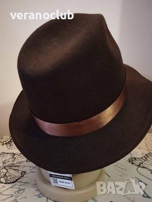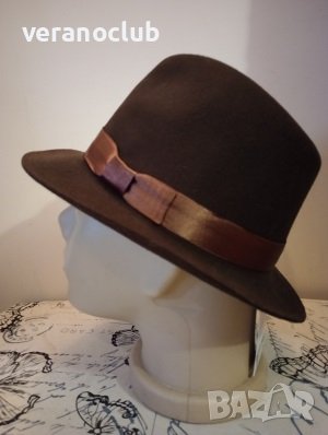 Мъжка зимна шапка с права мека периферия и е форма на широкополо бомбе в стил борсалино.