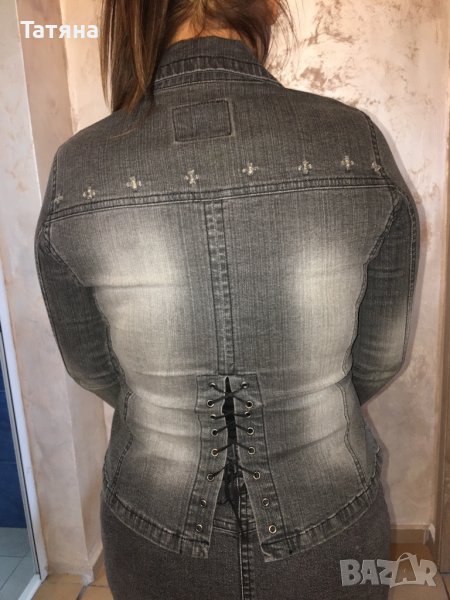 Страхотен дънков сет от дълга пола и дънково горнище! По полата има капси и бродерия, размера е Л, има лека еластичност!