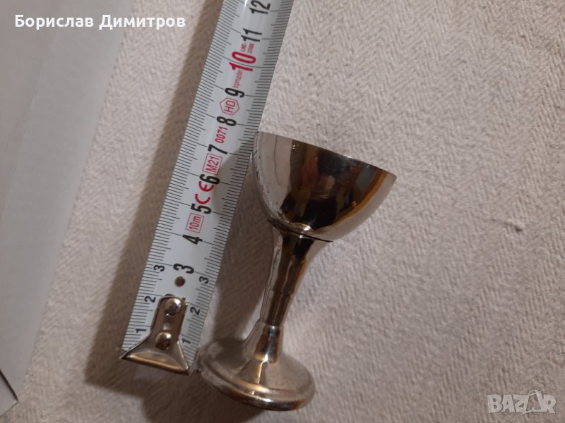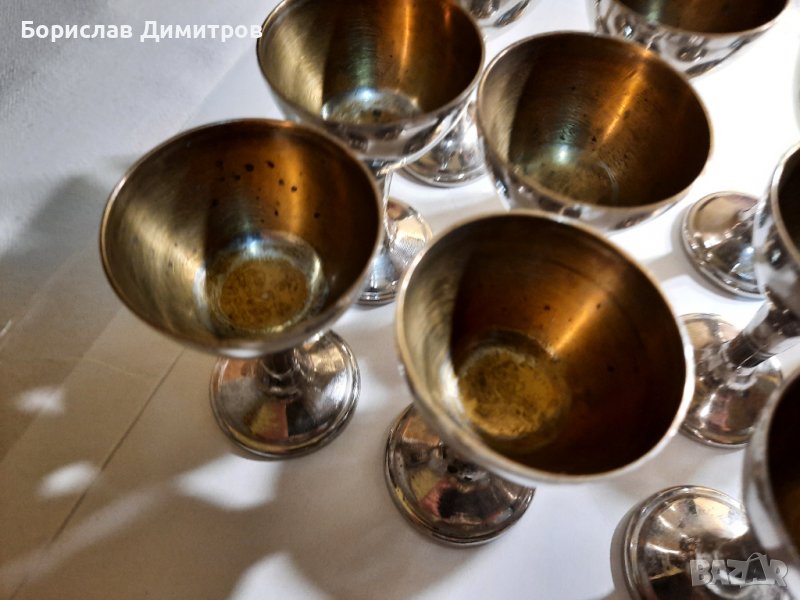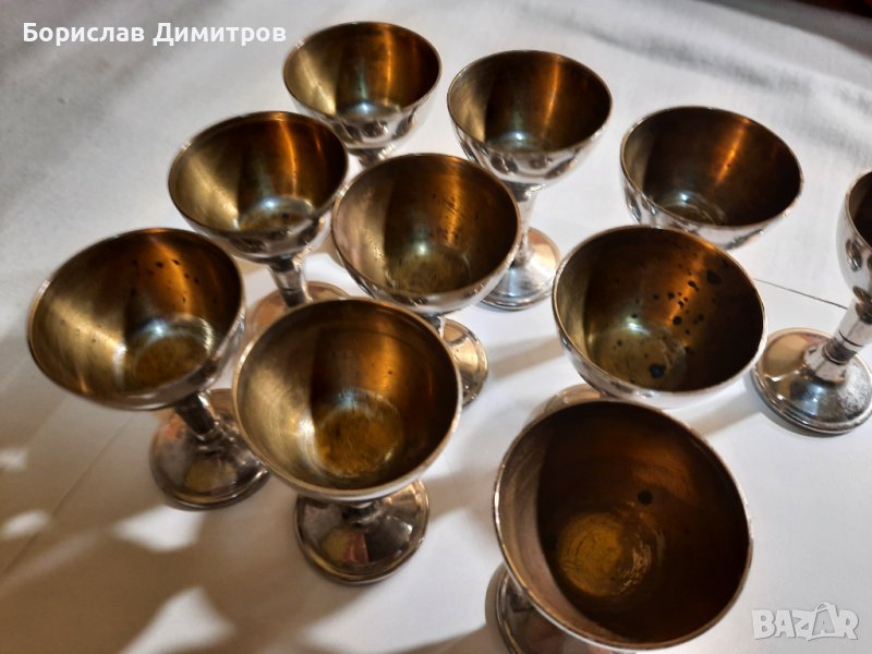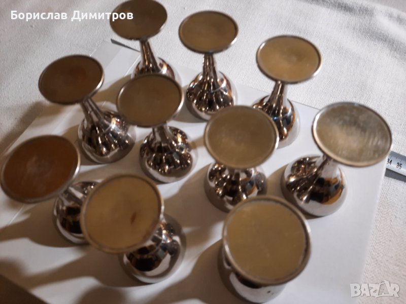Продавам старинен антикварен швейцарски комплект от 10 броя посребрени метални чашки → Обява 39565432