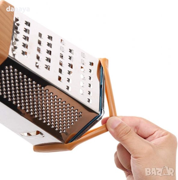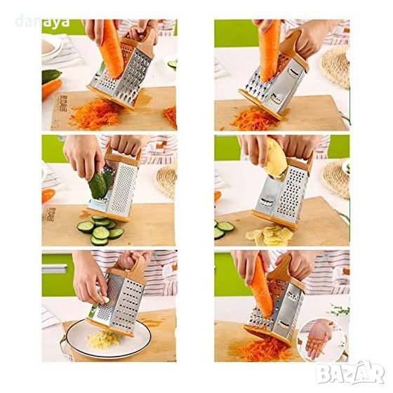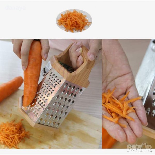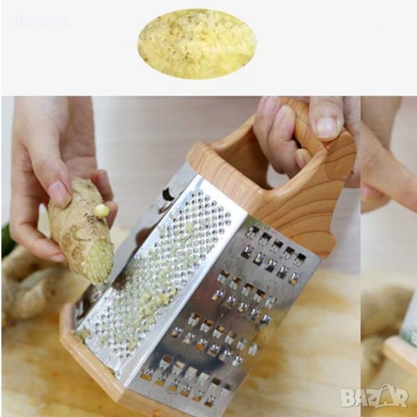 Ръчно ренде за зеленчуци. Шестоъгълното ренде е изработено от висококачествена огледално полирана неръждаема стомана. Рендето е оборудвано с удобна дръжка, изработена от пластмаса имитация на дърво. В допълнение, рендето е снабдено с нехлъзгаща се гумирана основа, която осигурява допълнително удобство при работа с него. Ръчно кухненско ренде с 6 начина на стъргане. Всяка домакиня ще оцени предимствата на това многофункционално ренде, защото благодарение на такова ренде можете да задоволите всяка нужда от нарязване на различни продукти. Практичният и модерен дизайн прави продукта много лесен за използване. Подходящо за миене в съдомиялна машина.