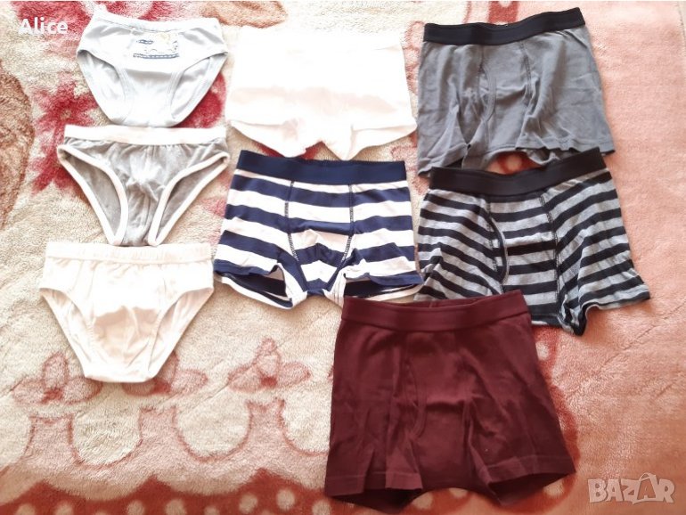 Продавам детски боксерки/ слипове. В отлично състояние! Много бързо умаляха, обувани са броени пъти. Белите боксерки на Н&М са чисто нови (не са обувани). Размер 116, 122 и 122/128.