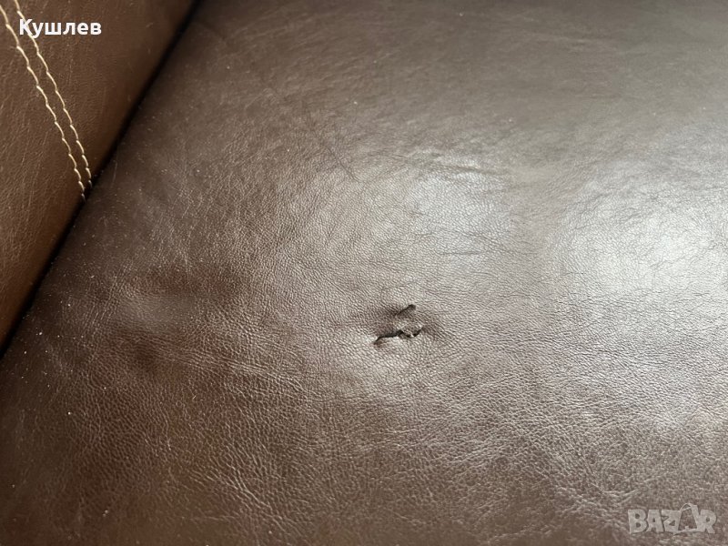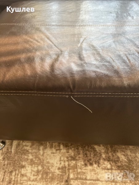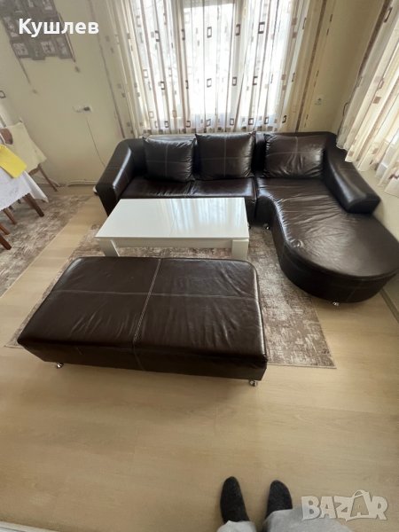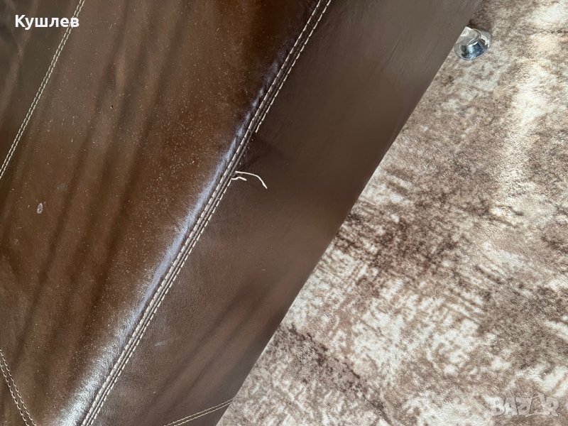 Продавам ъглов диван със следи от употреба,побира 9 човека /ако се наложи/,на три места има скъсана кожа,а на табуретката конец.