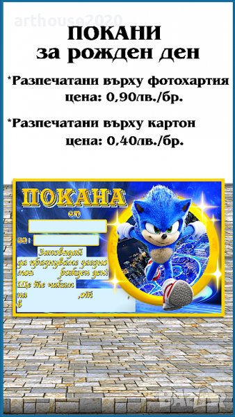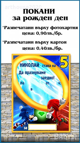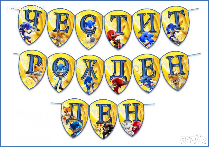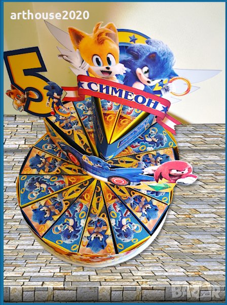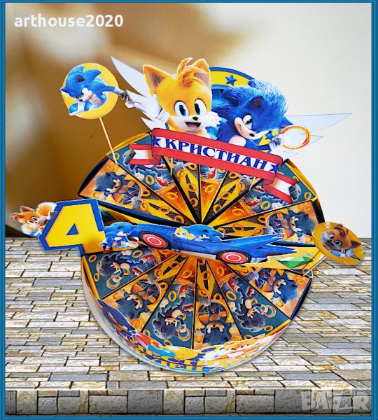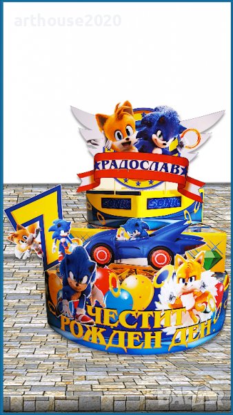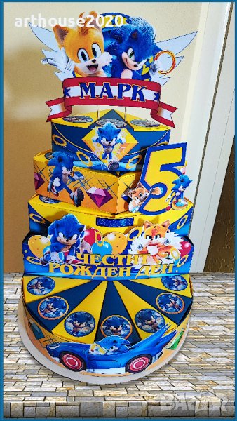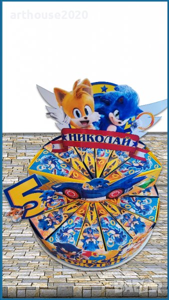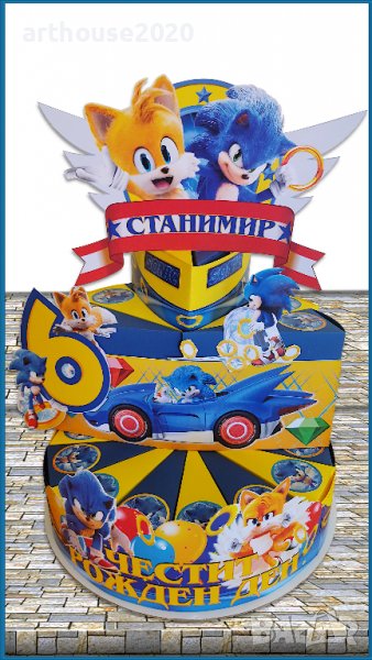 Дизайнерска картонена торта Соник,покани за РД,банери за стена,др.парти артикули