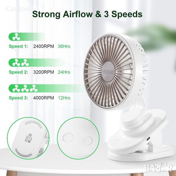 YISSVIC настолен вентилатор с клипс, 4000 mAh (макс. 36 часа),въртене на 360°,автоматична осцилация