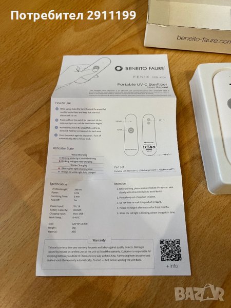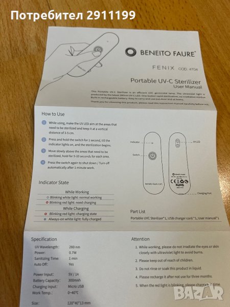 При покупка над 50лв. от профила ми - 1бр. подарък, само ми кажете че го искате. Преносим / джобен стерилизатор с ултравиолетова светлина. Марка: Beneito Faure (Испания). Комплект с micro USB кабел за зареждане. Разполагам с четири броя. Моля вижте снимките за повече детайли. Идеален за употреба или подарък. За още полезни предмети може да разгледате и другите ми обяви.