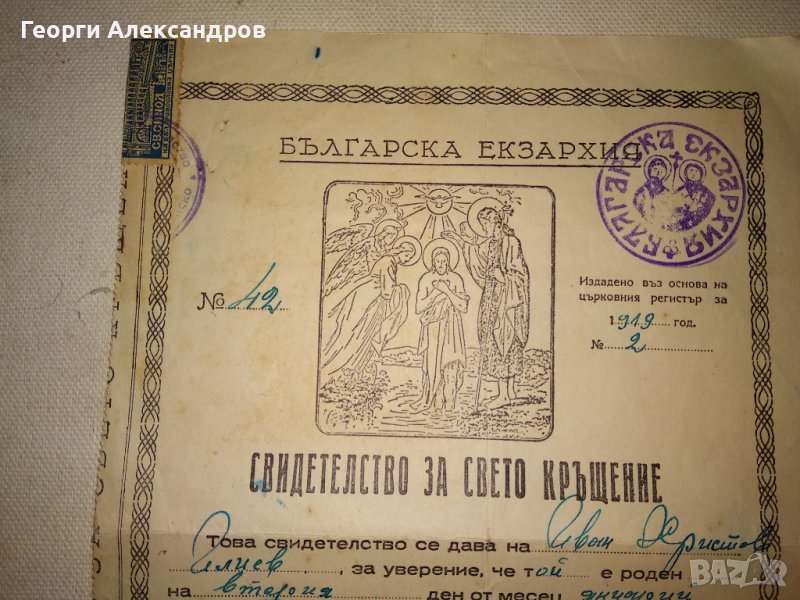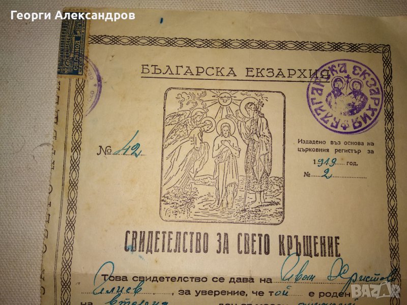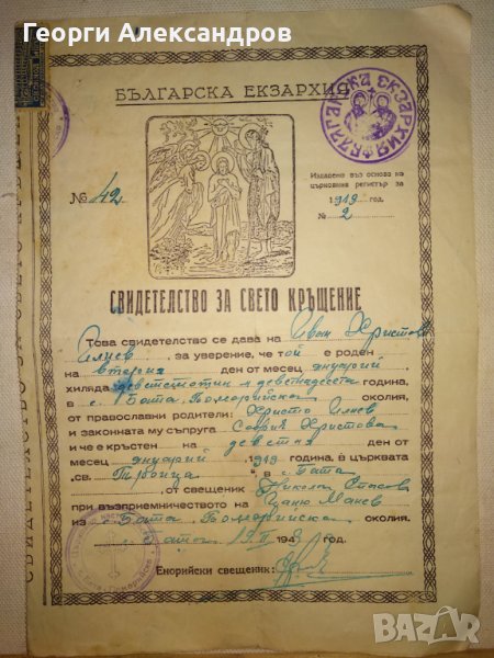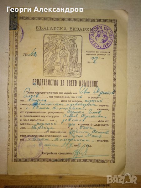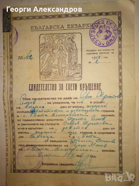 СВИДЕТЕЛСТВО за СВЕТО КРЪЩЕНИЕ - БЪЛГАРСКА ЕКЗАРХИЯ 1943 г. ЦАРСТВО БЪЛГАРИЯ Стар ДОКУМЕНТ → Обява 39578853