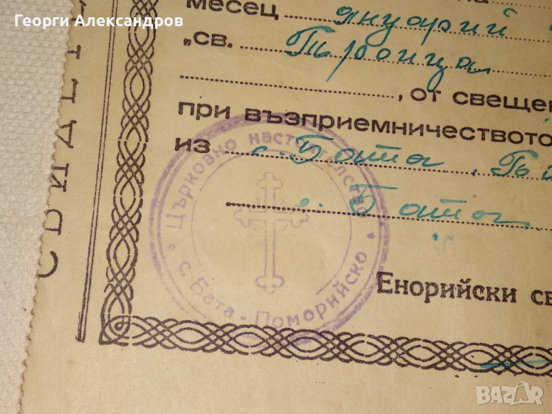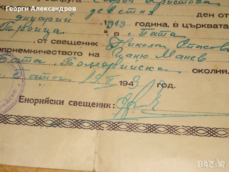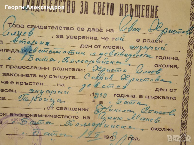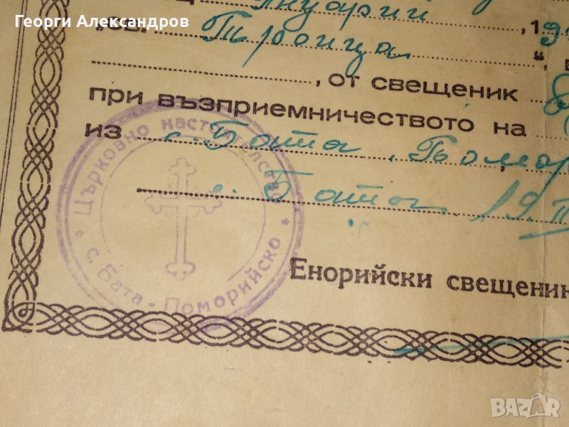 Рядък старинен църковен Кръщелен документ от Царство България, издаден през времето на Втората световна война; състояние много добло - според снимките, те го онагледяват! В обявите ми има и още 3 документа на същия човек - Свидетелство от Школата за кандитат подофицери при 44-ти пехотен Тунджански полк от 1941год., неговото и съответно и на съпругата му Свидетелства за венчание от 1946год.! СИМВОЛИЧНА цена! Изпращам по Еконт с Преглед и отстъпка-транспорт.