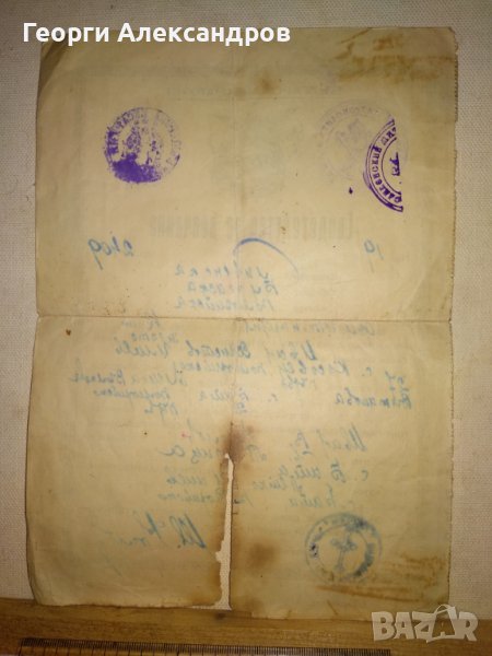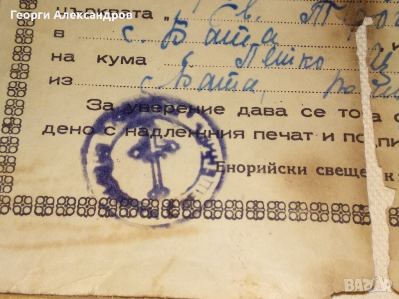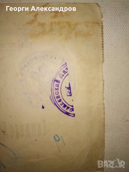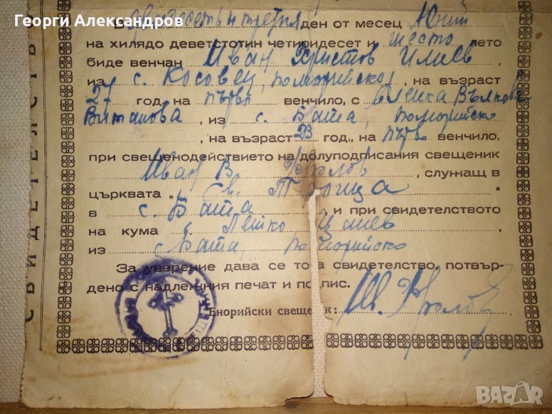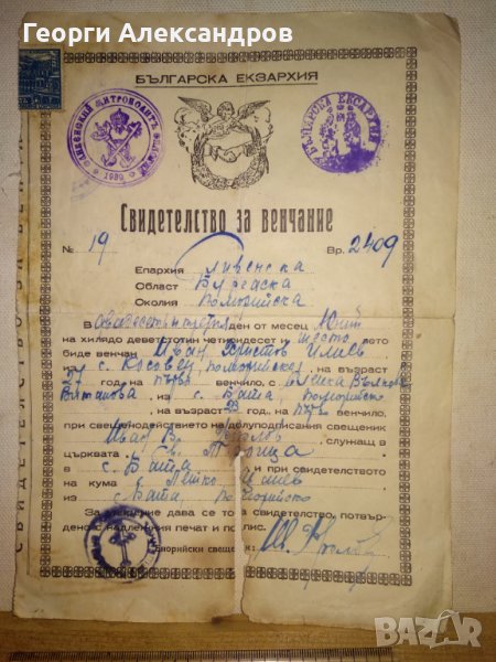 Рядък старинен църковен брачен документ от времето на последните месеци на Царство България, преди Референдума от септември същата година; състояние според снимките, те го онагледяват! В обявите ми има и още 3 документа на същия човек /съпругът/ - Свидетелство от Школата за кандитат подофицери при 44-ти пехотен Тунджански полк от 1941год., Свидетелството му за Свето Кръщение, издадено от Българска Екзархия в 1943год., и съответно и на съпругата му Свидетелство за венчание от 1946год.! Изпращам по Еконт с Преглед и отстъпка-транспорт.