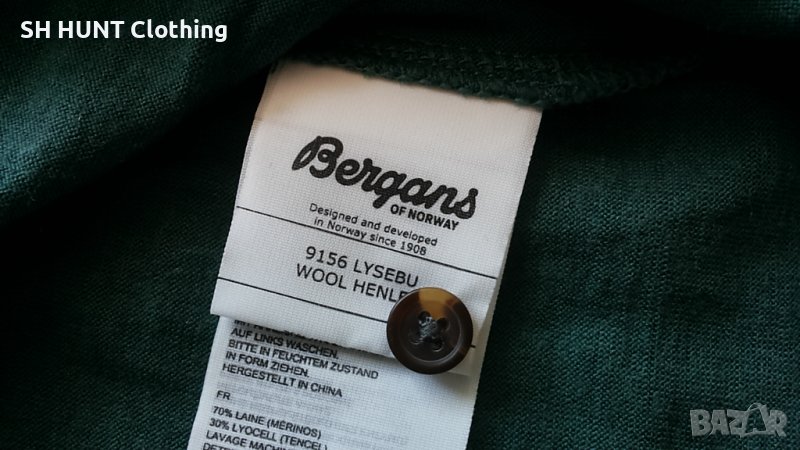 Марка: Bergans of NORWAY LYSEBU WOOL HENLEY 70% Merino Wool 30% Lyocell - Термо блуза 70% Мерино вълна 30% Лиоцел. Подходяща за ски , сноуборд , лов , риболов , свободно време и др. 19-174L Размер: XL - ширина под мишниците 60 см при нормално положение , разтяга се до 72 см , дължина 78 см.