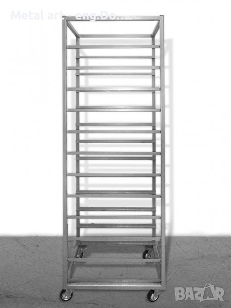 Количка за тави 60/40 см (палет). Изработена от стоманени профили с размери 25/25/2мм, прахово боядисани. Количките са с 4 плаващи колелца на 360⁰за по-голямо удобство при работа. Показаният модел количка е за 12 тави през 14 см. Изработваме и други модели колички с размери, посочени от клиента.