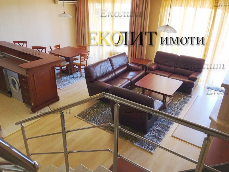 Луксозно обзаведен мезонет в комплекс МАКСИ с паркомясто. Разпределението включва входно антре с портманто. Всекидневна и трапезария визуално отделени от кухненски бокс с кожена мека мебел, холна маса, TV сет с LED телевизор, камина, трапезна маса със столове и вградена кухня с бяла техника от висок клас. Две непреходни стаи със спални комплекти. Две луксозни санитарни помещения с ъглова вана и душкабина, две панорамни тераси. Изложение - юг - югозапад. Към апартаментът има паркомясто. Комплексът предлага редица удобства, като басейни, спортен център, заведения, зелени площи и други. В комплексът предлагаме и други подобни имоти под наем.