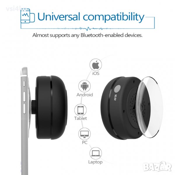 Корпус от пластмасаСиликонова вендуза Обхват: ~ 10 метра Честота на предаване: 2.4G HZ Захранване: DC5V / 100-120mA Батерия: 3.7 V 400mAh Време за зареждане: приблизително 3 часа Време на работа: приблизително 6 часа IP клас: IPX4 Честотна характеристика: IOOHZ-20KHZ Изходна мощност: 3w Тегло: 120г Размер на високоговорителя: около 85 * 85 * 45 мм