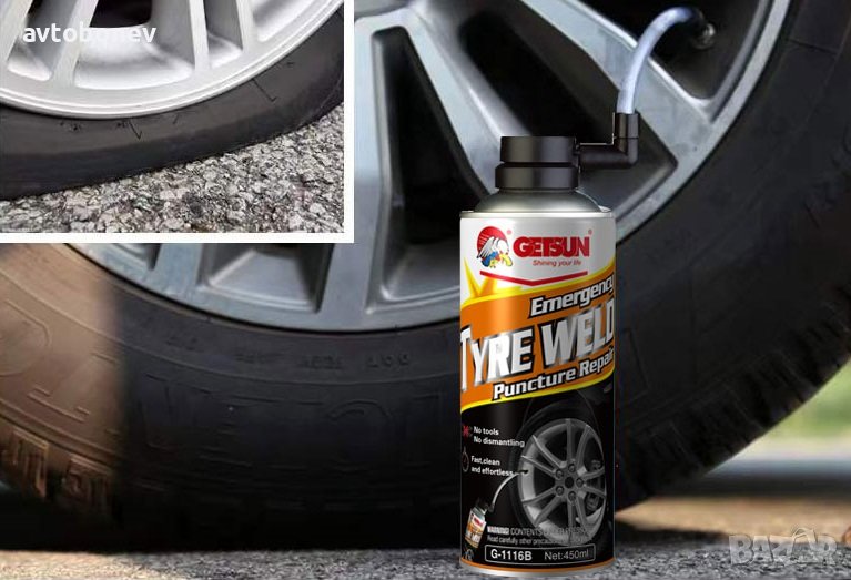 Поправя и надува отново незабавно вашата гума без инструменти и без демонтаж. Съвместим с всякаква камерна или безкамерна гума.