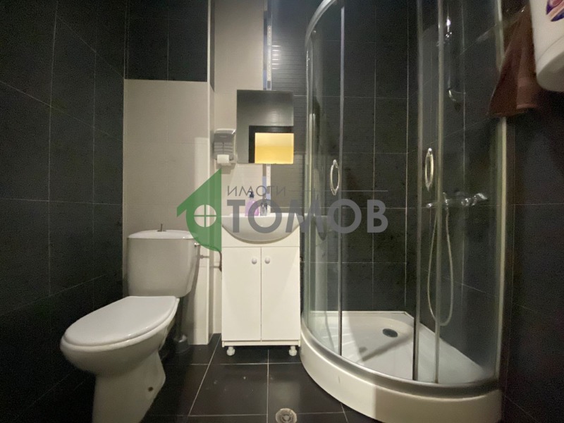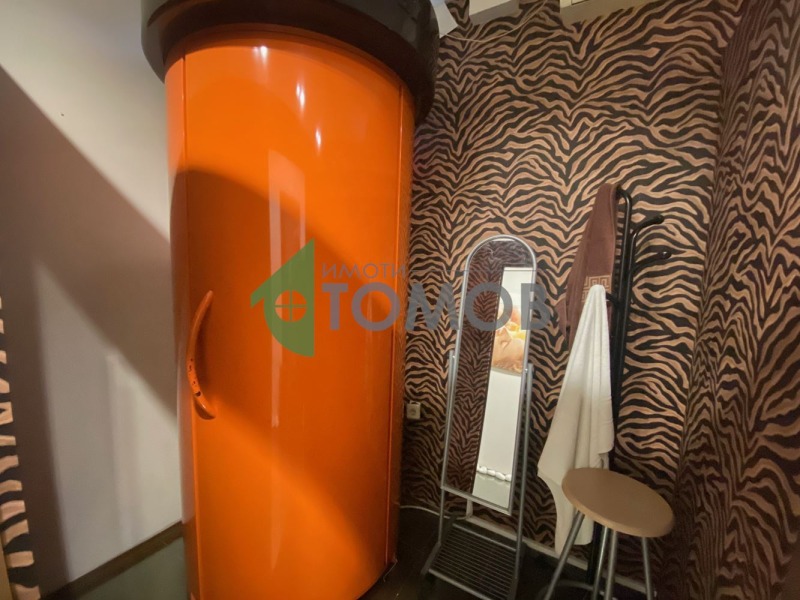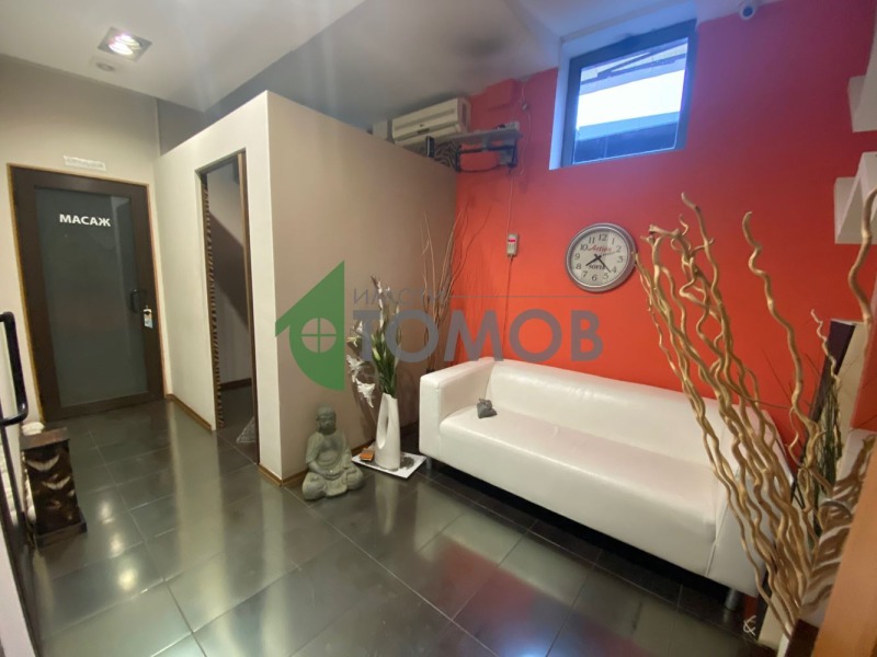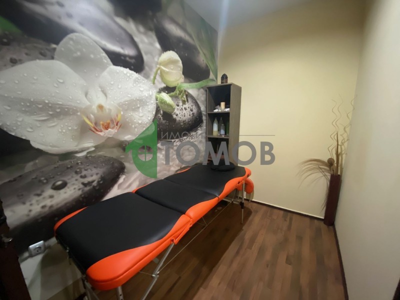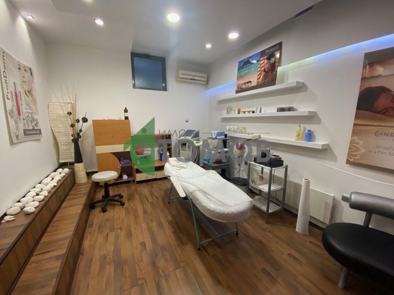 Имоти Томов представя на Вашето внимание оборудван козметичен салон с площ от 77кв.м. в центъра на град Шумен. Помещението се състои от 4 самостоятелни помещения, чакалня/рецепция, 2 санитарни помещения/бани с тоалетна/. В цената е включено оборудване: солариум, 3бр. козметични кушетки, козметичен робот 5 в 1, пароозонатор, апарат за кола маска и др. Отоплението е с климатици.