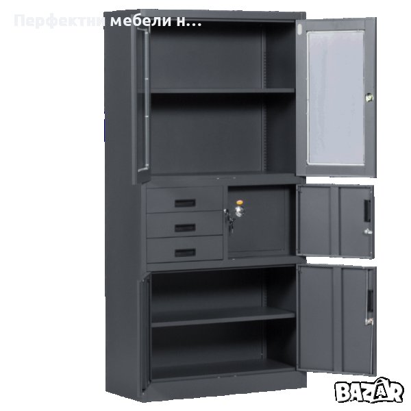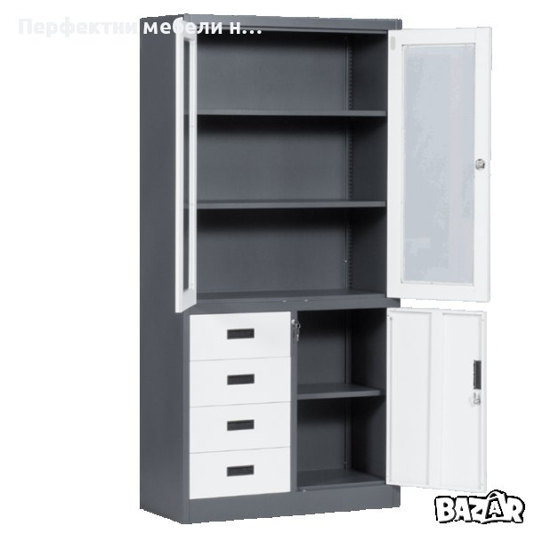 Метални шкафове с чекмеджета и стъклени врати в различни размери и цветове