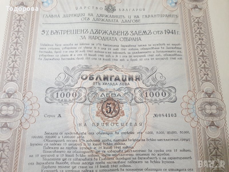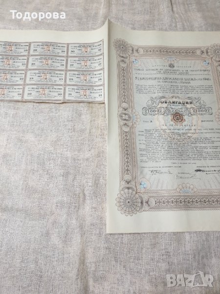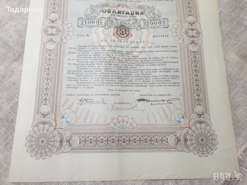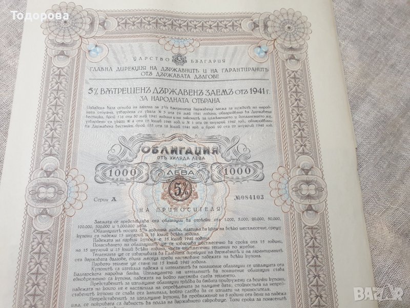 Облигации от държавен дълг на Военното министерство -1941г. от 1 000 лв., снимка 1 - Антикварни и старинни предмети - 39606463 Облигации от държавен дълг на Военното министерство -1941г. от 1 000 лв., снимка 2 - Антикварни и старинни предмети - 39606463 Облигации от държавен дълг на Военното министерство -1941г. от 1 000 лв., снимка 3 - Антикварни и старинни предмети - 39606463 Облигации от държавен дълг на Военното министерство -1941г. от 1 000 лв., снимка 4 - Антикварни и старинни предмети - 39606463 Облигации от държавен дълг на Военното министерство -1941г. от 1 000 лв., снимка 5 - Антикварни и старинни предмети - 39606463 Облигации от държавен дълг на Военното министерство -1941г. от 1 000 лв., снимка 6 - Антикварни и старинни предмети - 39606463 1/6