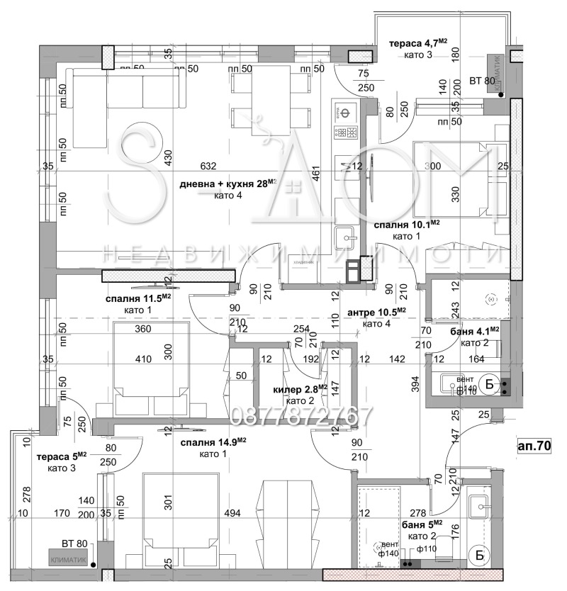 🚪 🗝 АПАРТАМЕНТ СЪСТОЯЩ СЕ ОТ 👉 дневна с кухненски бокс, три спални, две бани с тоалетна, килер, две тераси, входно антре.